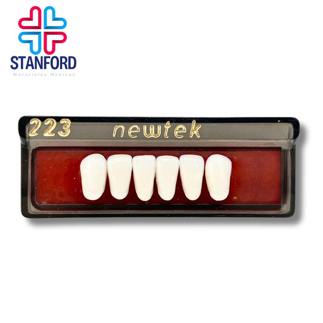 "Dientes de resina acrílica. Alta calidad en materiales y acabado, así como gran resistencia. Características: · crosslinked · fluorescencia natural · pigmentación computarizada · larga durabilidad. Tonos newhue: 59, 61, 62, 65, 66. Tonos vita: a1, a2, a3, a3.5, A4, b1, b2."
