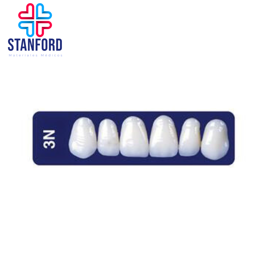 "Dientes de resina acrílica. Alta calidad en materiales y acabado, así como gran resistencia. Características: · crosslinked · fluorescencia natural · pigmentación computarizada · larga durabilidad. Tonos newhue: 59, 61, 62, 65, 66. Tonos vita: a1, a2, a3, a3.5, A4, b1, b2."