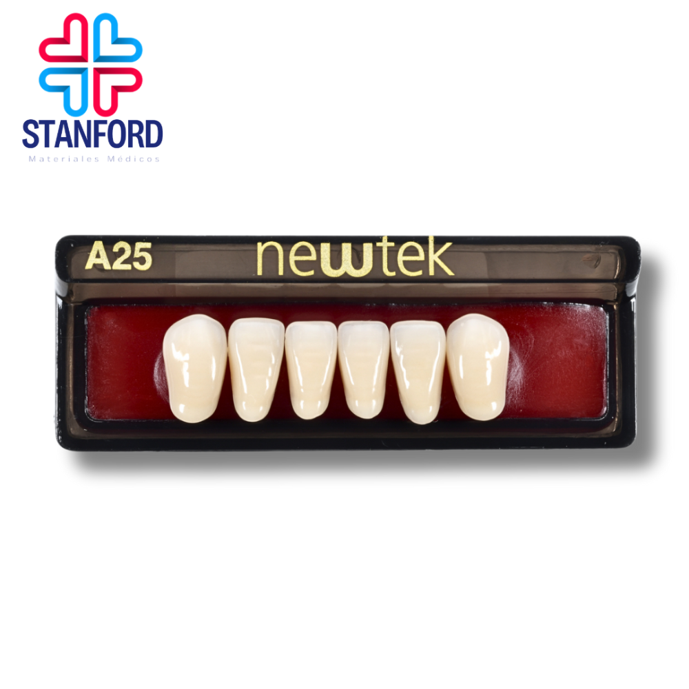 "Dientes de resina acrílica. Alta calidad en materiales y acabado, así como gran resistencia. Características: · crosslinked · fluorescencia natural · pigmentación computarizada · larga durabilidad. Tonos newhue: 59, 61, 62, 65, 66. Tonos vita: a1, a2, a3, a3.5, A4, b1, b2."